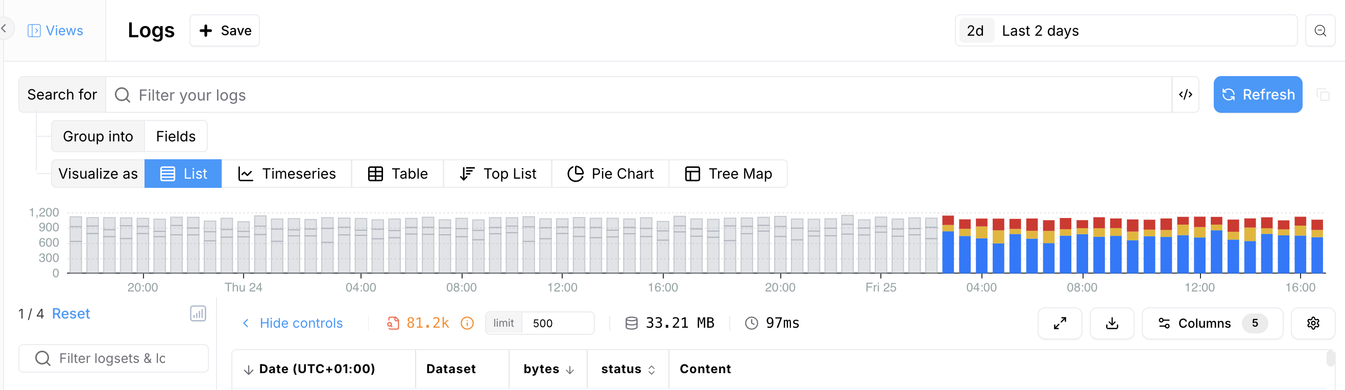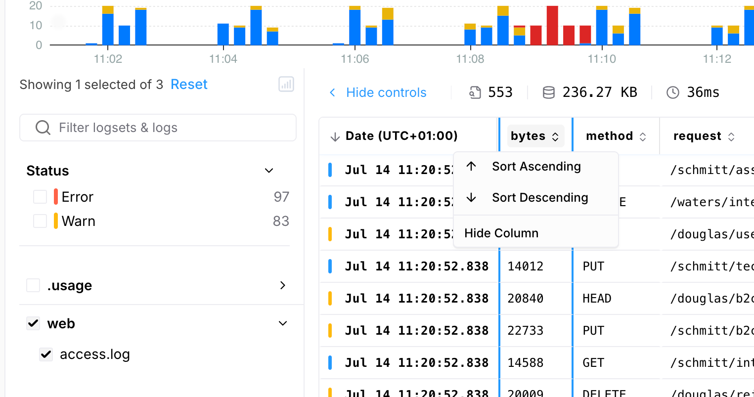 - Enter a search query in the search bar to filter results, or leave it empty to return all log events. Learn more about our Query Language here.