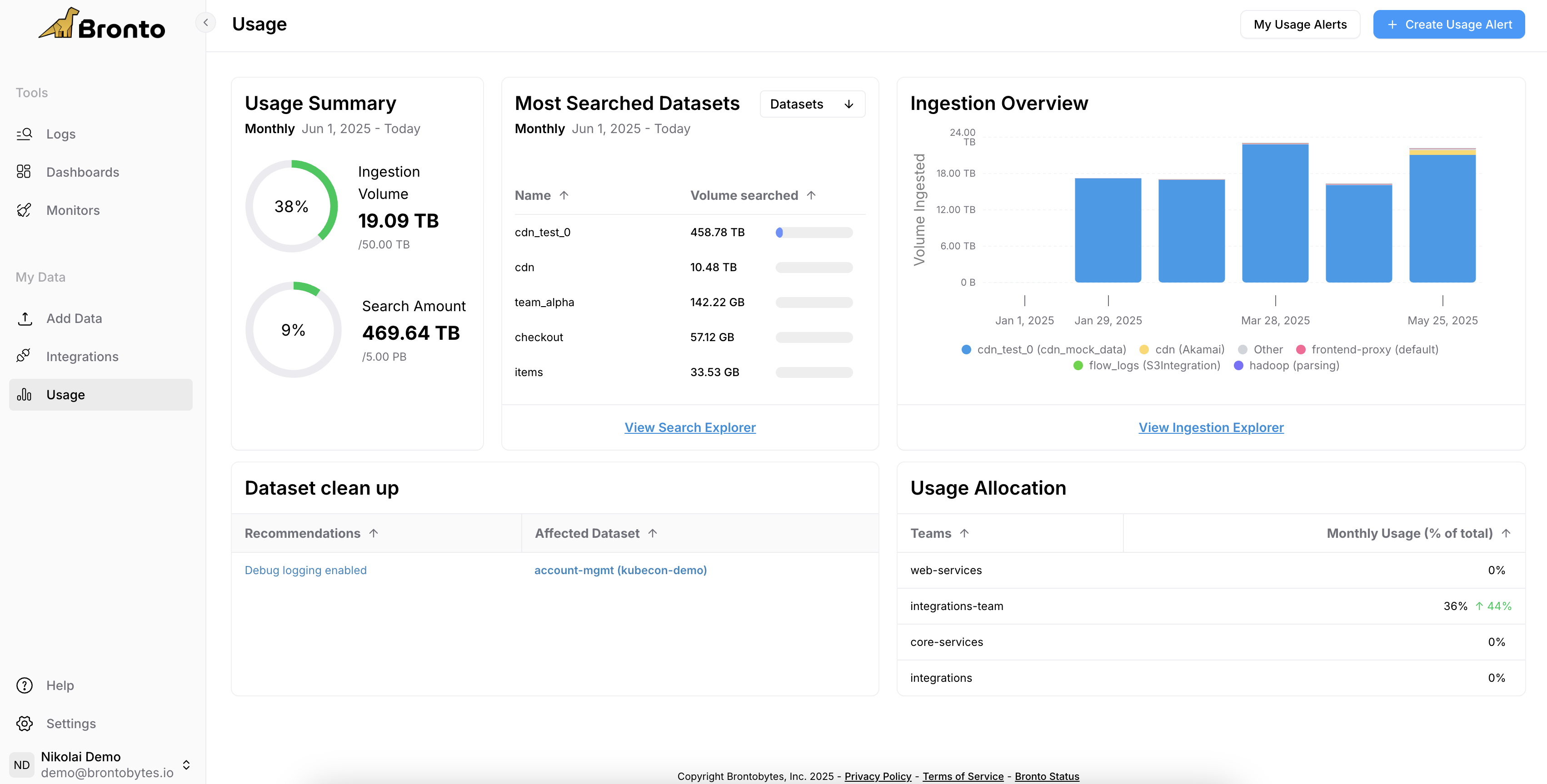 Provides a high-level overview of search and ingestion activities, with direct links to tools for deeper analysis.- Usage Summary: Get a quick snapshot of your Bronto usage for the current month, broken down into Ingestion and Search.