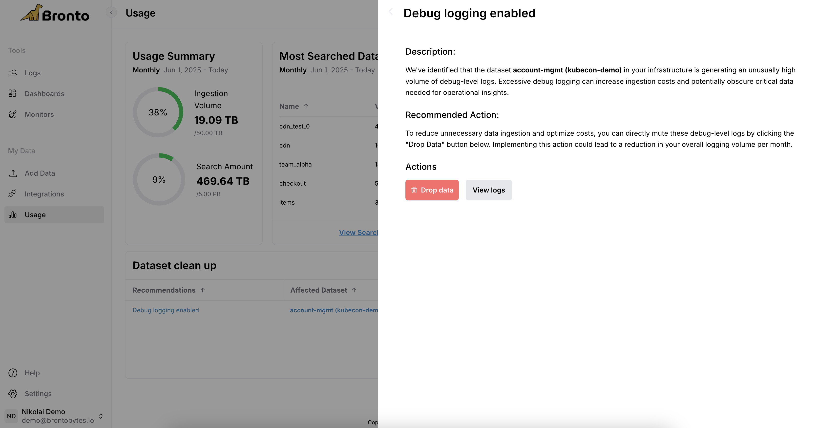 Gain a high-level overview of your Bronto usage, ensuring you stay within your quota. Receive system-generated recommendations to optimize usage and reduce costs, with drill-down tools for deeper insights.Usage Menu